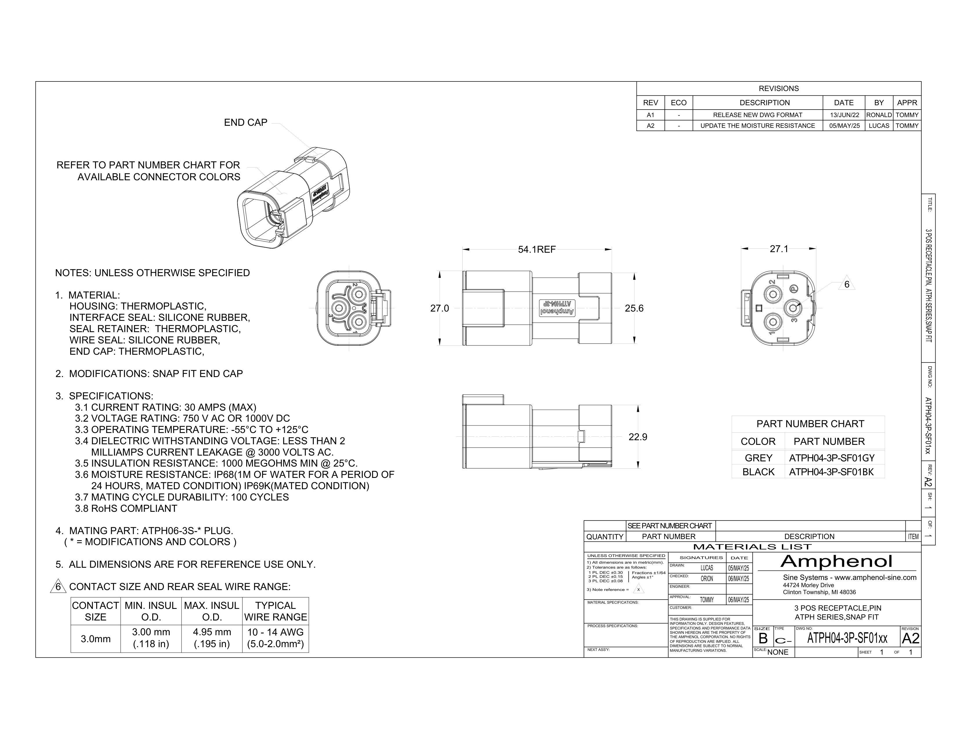 Amphenol SINE Systems ATPH04-3P-SF01GY Automotive Connectors 3 POSITION RECEPTACLE, GREY, PIN
